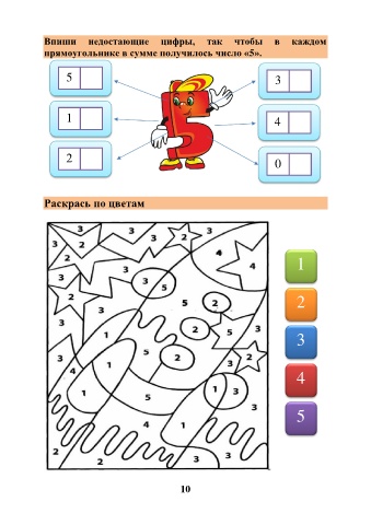 Впиши недостающие цифры, так чтобы в каждом прямоугольнике в сумме получилось число «5». 5 3 1 6 1 4 1 1 2 0 1 3 Раскрась по цветам 1 2 3 4 5 10