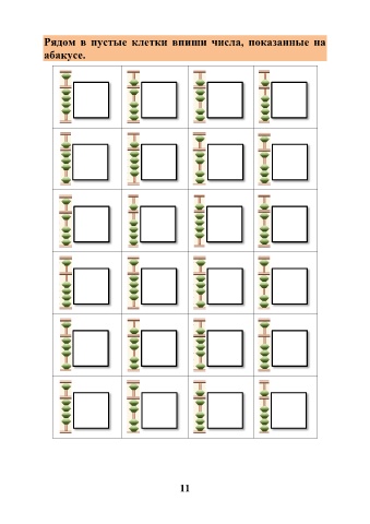 Рядом в пустые клетки впиши числа, показанные на абакусе. 11