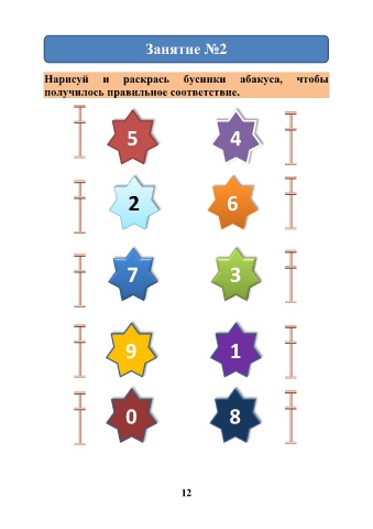 Занятие №2 Нарисуй и раскрась бусинки абакуса, чтобы получилось правильное соответствие. 5 4 2 6 7 3 9 1 0 8 12