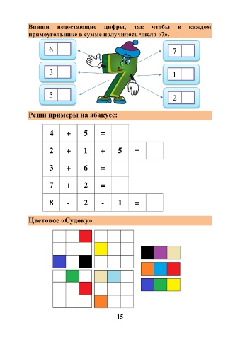 Впиши недостающие цифры, так чтобы в каждом прямоугольнике в сумме получилось число «7». 6 7 1 6 3 1 1 1 5 2 1 3 Реши примеры на абакусе: 4 + 5 = 2 + 1 + 5 = 3 + 6 = 7 + 2 = 8 - 2 - 1 = Цветовое «Судоку». 15